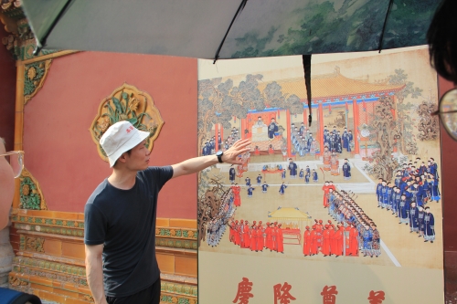 师生一行于午门集合,赵老师讲述午门的历史由来以及午门献俘的典故,拉开了本次活动的序幕。穿过午门,走过金水桥,师生们来到太和殿。赵老师从太和殿殿顶结构、殿前陈设、装饰彩绘等方面向师生们进行了详细介绍,师生们深切感受到皇家典礼的恢弘气派。