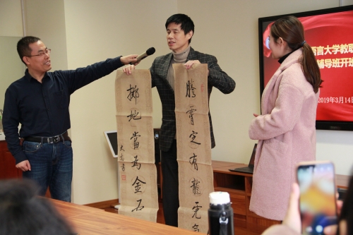 本次声乐班的辅导老师由艺术学院金珂宇老师担任,金老师鼓励大家在声乐学习方面坚持下去,娱乐的同时加强交流,并为学员们即兴演唱一首《唱山歌》。陈大志老师为金珂宇老师献字,送上了美好的祝福与感谢。