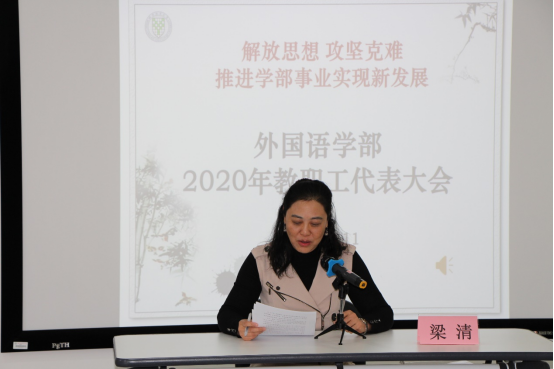 大会在全体代表齐声合唱的国歌声中正式开幕。学部党委书记梁清首先致辞,她表示二级教职工代表大会制度是学校教代会制度的完善和补充,是教职工行使民主权力,实行民主管理、民主监督的重要形式和基本制度。外国语学部党委历来非常重视教代会的作用,把它作为推进学部改革发展的重要制度和机制。通过教代会制度充分发挥教职工的主人翁作用;通过教代会提案、通过听取和审议工作报告,发挥教代会代表参政议政的作用,为学部发展建设建睿智之言、谋务实之策。梁老师强调,教代会代表肩负着学部全体教职员工的重托,任务光荣而又艰巨,希望大家履行好代表的职责,把大会的召开情况、学部发展的思路传递给老师们,把大家的思想统一到学部事业发展上来,并持续关注倾听教职员工的心声,为学部当前和今后的发展,为维护教职工的切身利益建言献策,使学部形成团结、民主、务实、奋进的氛围。
